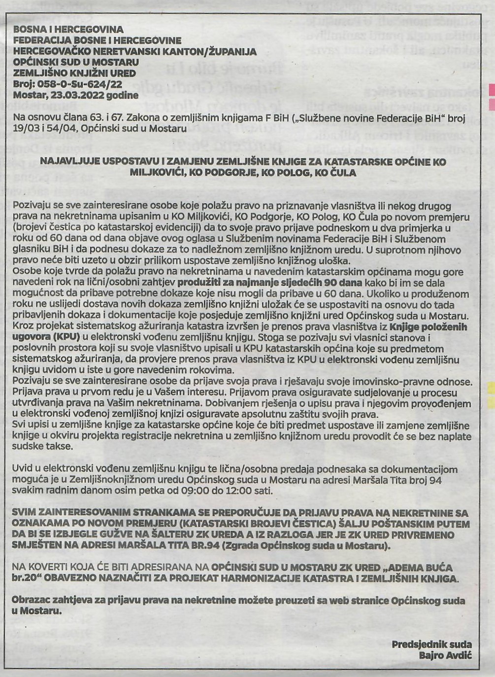 Općinski sud u Mostaru NAJAVLJUJE USPOSTAVU I ZAMJENU ZEMLJIŠNE KNJIGE ZA KATASTARSKE OPĆINE KO MILJKOVIĆI, KO PODGORJE, KO POLOG, KO ČULA - Federalna uprava za geodetske i imovinsko-pravne poslove