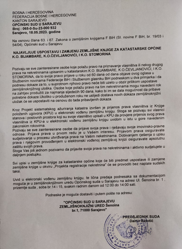Općinski sud u Sarajevu NAJAVLJUJE USPOSTAVU I ZAMJENU ZEMLJIŠNE KNJIGE ZA KATASTARSKE OPĆINE BIJAMBARE, ČEVLJANOVIĆI, i STOMORINA - Federalna uprava za geodetske i imovinsko-pravne poslove