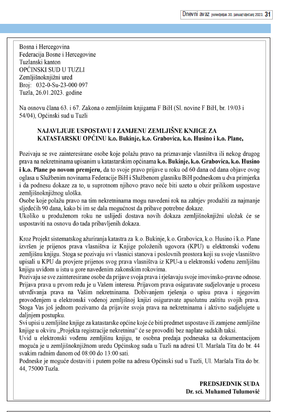 Općinski sud u Tuzli NAJAVLJUJE USPOSTAVU I ZAMJENU ZEMLJIŠNE KNJIGE ZA KATASTARSKE OPĆINE Bukinje, Grabovica, Husino i Plane