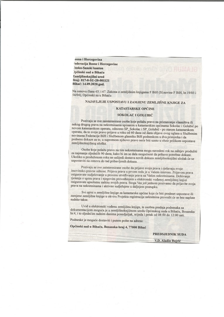 Pozivaju se sve zainteresirane osobe koje polažu pravo na priznavanje vlasništva ili nekog drugog prava na nekretninama upisanim u katastarskim općinama Sokolac i Golubić po novom katastarskom operatu, odnosno SP_Sokolac i SP_Golubić - po starom katastarskom operatu, da to svoje pravo prijave u roku od 60 dana od dana objave ovog oglasa u Službenim novinama Federacije BiH i Službenom glasniku BiH podneskom u dva primjerka i da podnesu dokaze za to, u suprotnom njihovo pravo neće biti uzeto u obzir prilikom uspostave zemljišnoknjižnog uloška.