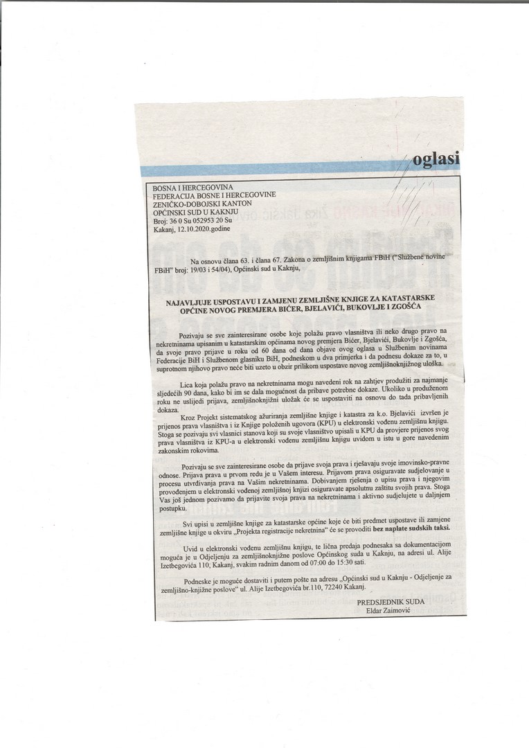 Pozivaju se sve zainteresirane osobe koje polažu pravo vlasništva ili neko drugo pravo na nekretninama upisanim u katastarskim općinama novog premjera Bićer, Bjelavići, Bukovlje i Zgošća, da svoje pravo prijave u roku od 60 dana od dana objave ovog oglasa u Službenim novinama Federacije BiH i Službenom glasniku BiH, podneskom u dva primjerka i da podnesu dokaze za to, u suprotnom njihovo pravo neće biti uzeto u obzir prilikom uspostave novog zemljišnoknjižnog uloška.