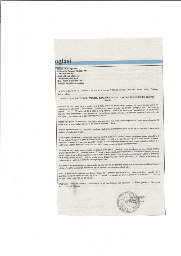 Pozivaju se sve zainteresirane osobe koje polažu pravo na priznavanje svojine ili nekog drugog prava na nekretninama upisanim u katastarskim općinama Lipovice i Memići po novom premjeru da to svoje pravo prijave u roku od 60 dana od dana objave ovog oglasa u Službenim novinama Federacije BiH i Službenom glasniku BiH podneskom u dva primjerka i da podnesu dokaze za to, u suprotnom njihovo pravo neće biti uvaženo prilikom uspostave zemljišnoknjižnog uloška.