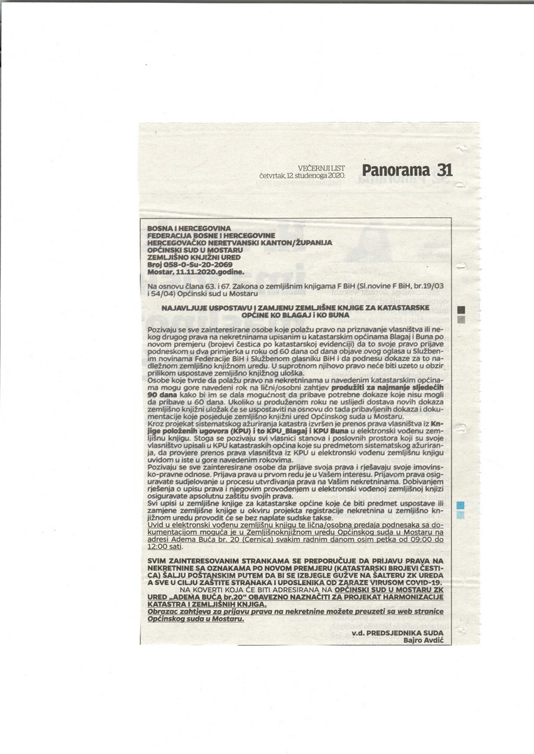 Općinski sud u Mostaru NAJAVLJUJE USPOSTAVU I ZAMJENU ZEMLJIŠNE KNJIGE ZA KATASTARSKE OPĆINE BLAGAJ i KO BUNA