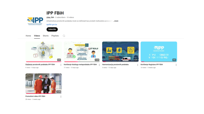 U okviru ove inicijative izrađen je jedan promotivni video i četiri edukativna video zapisa, koji detaljno obrađuju unos podataka u registre, katalog metapodataka, proces dijeljenja prostornih podataka, te harmonizaciju prostornih podataka u skladu s INSPIRE direktivom. Dodatno, kreirano je pet kratkih video zapisa u Reels formatu, koji na kreativan i zanimljiv način komuniciraju ključne aspekte IPP FBiH.