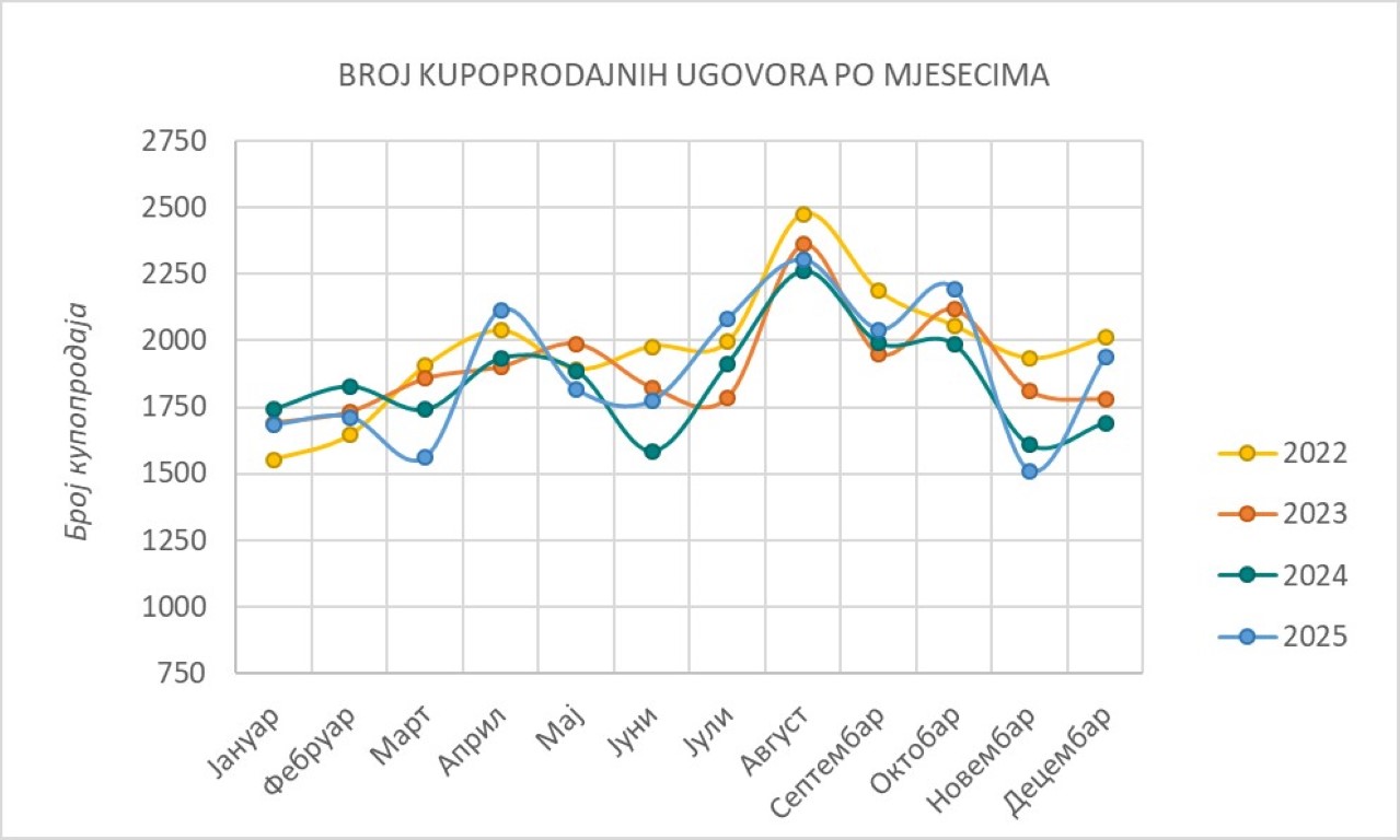 Укупан број купопродајних уговора регистрован у периоду од 01.01.2025. до 31.12.2025. године на подручју Федерације БиХ износи 23.398, док остварена вриједност из купопродајних уговора износи 1.896.158.837 КМ. Од тог броја, 22.726 уговора са оствареном вриједношћу од 1.808.489.325 КМ се односи на секундарно тржиште, док се 672 уговора са оствареном вриједношћу од 87.669.511 КМ односи на прве продаје.