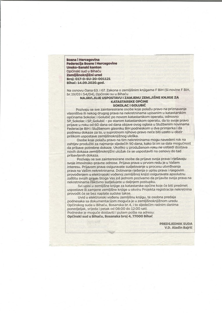 Pozivaju se sve zainteresirane osobe koje polažu pravo na priznavanje vlasništva ili nekog drugog prava na nekretninama upisanim u katastarskim općinama Sokolac i Golubić po novom katastarskom operatu, odnosno SP_Sokolac i SP_Golubić - po starom katastarskom operatu, da to svoje pravo prijave u roku od 60 dana od dana objave ovog oglasa u Službenim novinama Federacije BiH i Službenom glasniku BiH podneskom u dva primjerka i da podnesu dokaze za to, u suprotnom njihovo pravo neće biti uzeto u obzir prilikom uspostave zemljišnoknjižnog uloška.