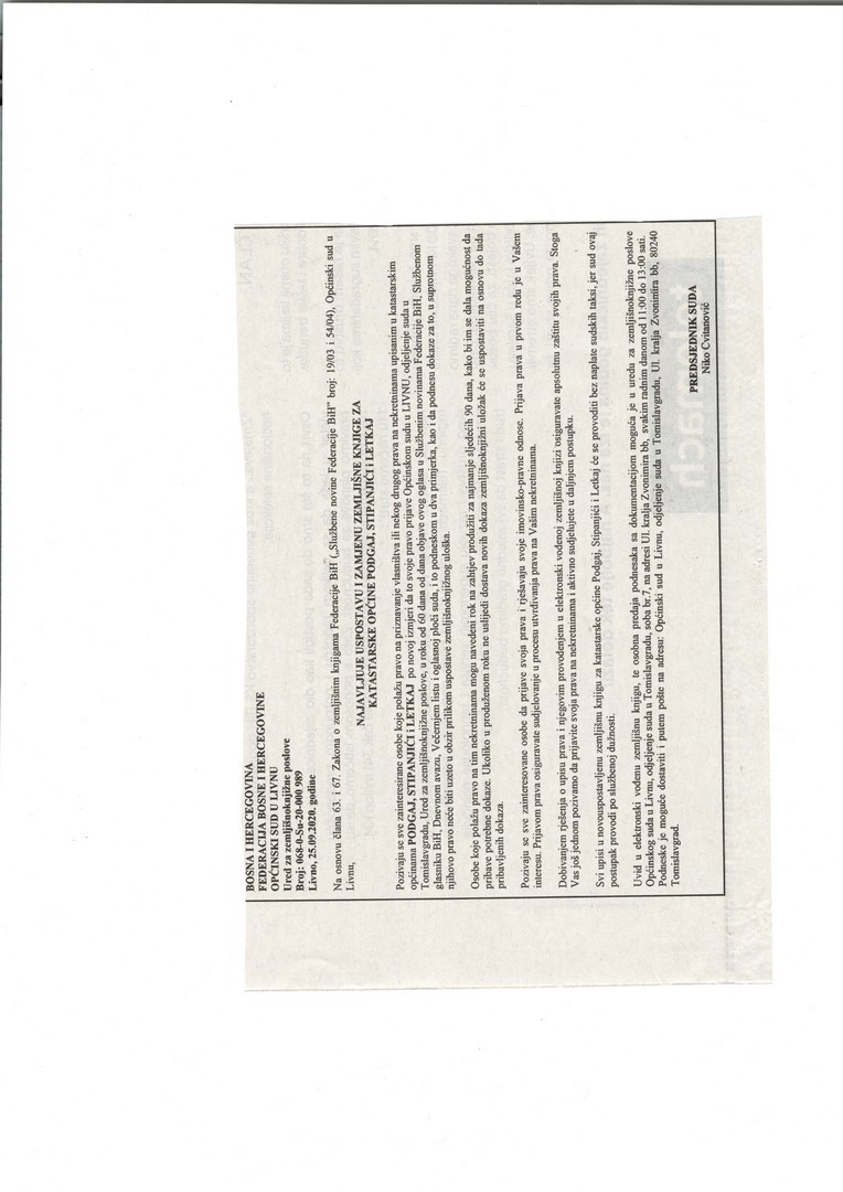 Pozivaju se sve zainteresirane osobe koje polažu pravo na priznavanje vlasništva ili nekog drugog prava na nekretninama upisanim u katastarskim općinama PODGAJ, STIPANJIĆI i LETKAJ po novoj izmjeri da to svoje pravo prijave Općinskom sudu u LIVNU, odjeljenje suda u Tomislavgradu, Ured za zemljišnoknjižne poslove, u roku od 60 dana od dana objave ovog oglasa u Službenim novinama Federacije BiH, Službenom glasniku BiH, Dnevnom avazu, Večernjem listu i oglasnoj ploči suda, i to podneskom u dva primjerka, kao i da podnesu dokaze za to, u suprotnom njihovo pravo neće biti uzeto u obzir prilikom uspostave zemljišnoknjižnog uloška.