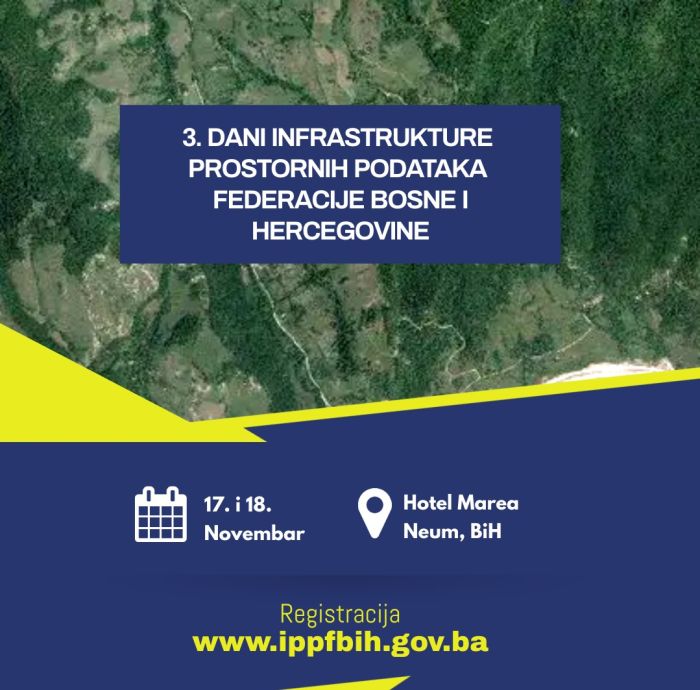 Federalna uprava za geodetske i imovinsko – pravne poslove kao koordinaciono tijelo Infrastrukture prostornih podataka u Federaciji BiH organizuje konferenciju "3. Dani Infrastrukture prostornih podataka Federacije Bosne i Hercegovine " u Neumu, hotel Marea od 17. do 18.11.2022. godine.
