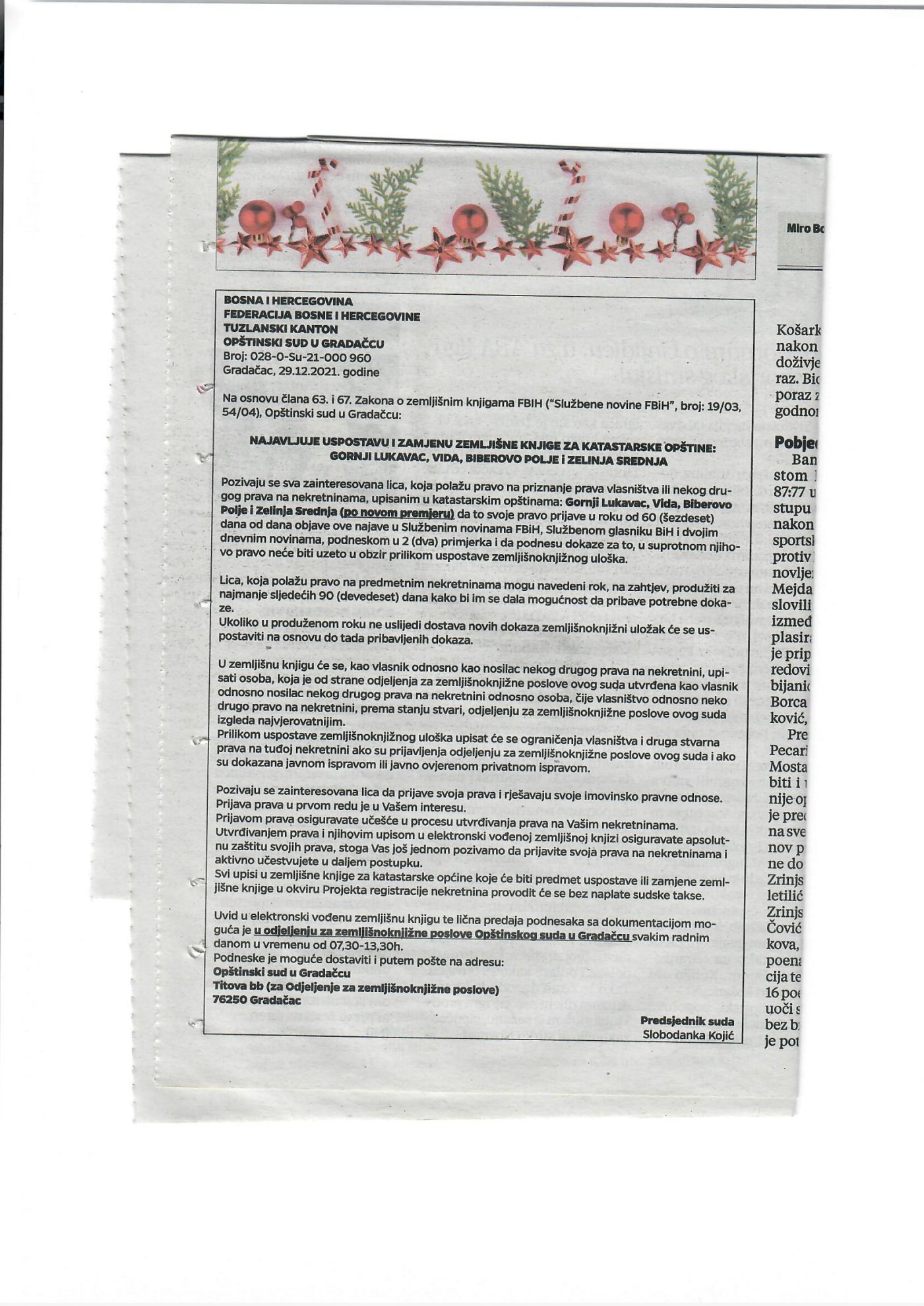 Pozivaju se sva zainteresovana lica, koja polažu pravo na priznanje prava vlasništva ili nekog drugog prava na nekretninama, upisanim u katastarskim opštinama: Gornji Lukavac, Vida, Biberovo Polje i Zelinja Srednja (po novom premjeru) da to svoje pravo prijave u roku od 60 (šezdeset) dana od dana objave ove najave u Službenim novinama FBiH, Službenom glasniku BiH i dvojim dnevnim novinama, podneskom u 2 (dva) primjerka i da podnesu dokaze za to, u suprotnom njihovo pravo neće biti uzeto u obzir prilikom uspostave zemljišnoknjižnog uloška.