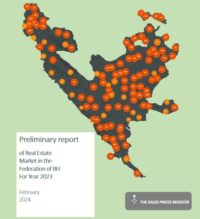 Through the realization of the activities of the Federal Administration for Geodetic and Real Property Affairs (FGA) related to the establishment of the Sales Price Register (SPR) in co-operation with the Tax Administration of the Federation BiH (TA FBiH) and local self-government units (LSGU), it was made a Real Estate Market preliminary report of the Federation of BiH for Year 2023.