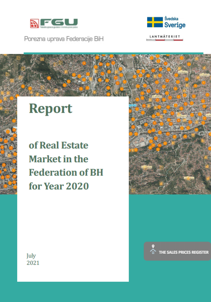 Through the realization of the activities of the Federal Administration for Geodetic and Real Property Affairs (FGA) related to the establishment of the Sales Price Register (SPR) that is realized through the implementation of the Swedish donor project "Capacity Building for the Improvement of Land Administration and Procedures in Bosnia and Herzegovina" - CILAP, in co-operation with the Tax Administration of the Federation BiH (TA FBiH) and local self-government units (LSGU), it was made a Real Estate Market Report of the Federation of BiH for Year 2020.