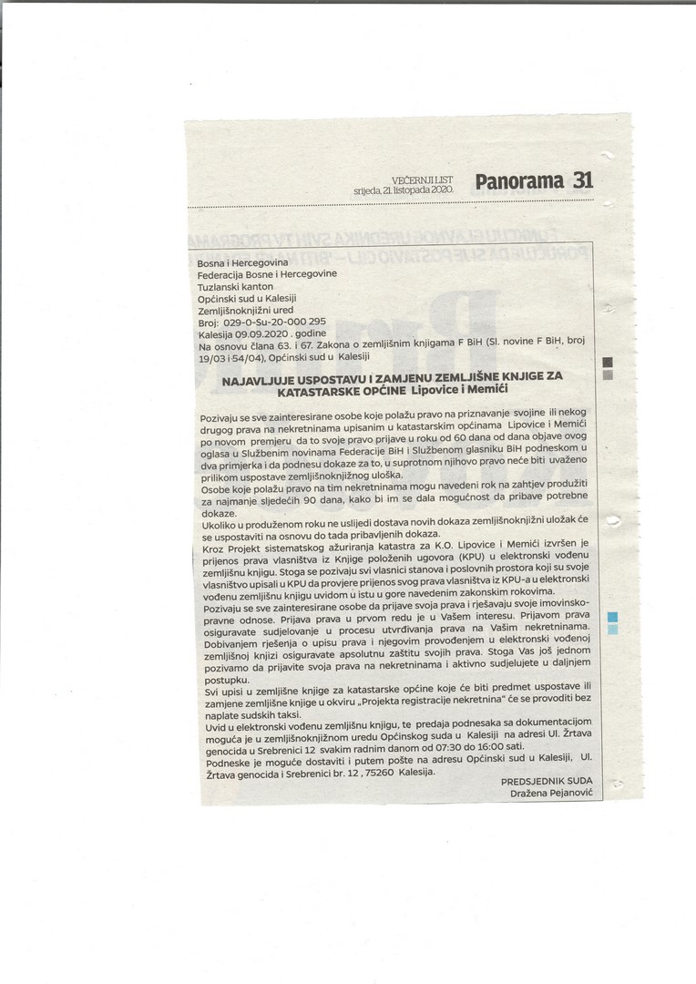 Pozivaju se sve zainteresirane osobe koje polažu pravo na priznavanje svojine ili nekog drugog prava na nekretninama upisanim u katastarskim općinama Lipovice i Memići po novom premjeru da to svoje pravo prijave u roku od 60 dana od dana objave ovog oglasa u Službenim novinama Federacije BiH i Službenom glasniku BiH podneskom u dva primjerka i da podnesu dokaze za to, u suprotnom njihovo pravo neće biti uvaženo prilikom uspostave zemljišnoknjižnog uloška.