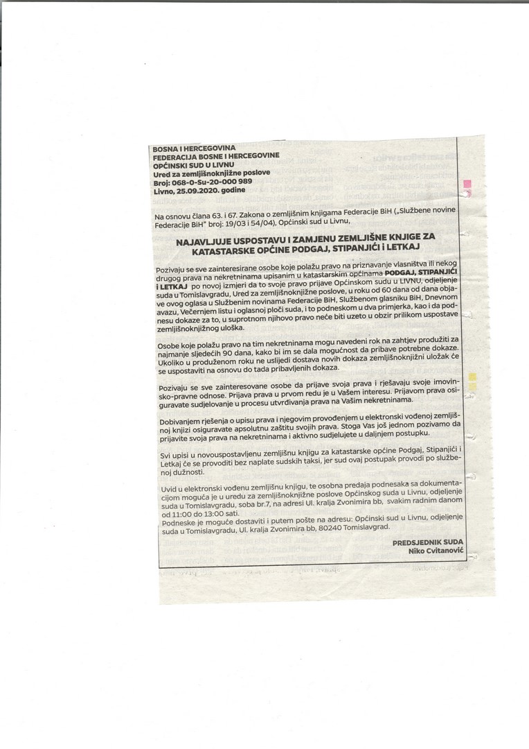 Pozivaju se sve zainteresirane osobe koje polažu pravo na priznavanje vlasništva ili nekog drugog prava na nekretninama upisanim u katastarskim općinama PODGAJ, STIPANJIĆI i LETKAJ po novoj izmjeri da to svoje pravo prijave Općinskom sudu u LIVNU, odjeljenje suda u Tomislavgradu, Ured za zemljišnoknjižne poslove, u roku od 60 dana od dana objave ovog oglasa u Službenim novinama Federacije BiH, Službenom glasniku BiH, Dnevnom avazu, Večernjem listu i oglasnoj ploči suda, i to podneskom u dva primjerka, kao i da podnesu dokaze za to, u suprotnom njihovo pravo neće biti uzeto u obzir prilikom uspostave zemljišnoknjižnog uloška.