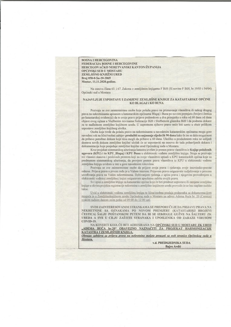 Općinski sud u Mostaru NAJAVLJUJE USPOSTAVU I ZAMJENU ZEMLJIŠNE KNJIGE ZA KATASTARSKE OPĆINE BLAGAJ i KO BUNA
