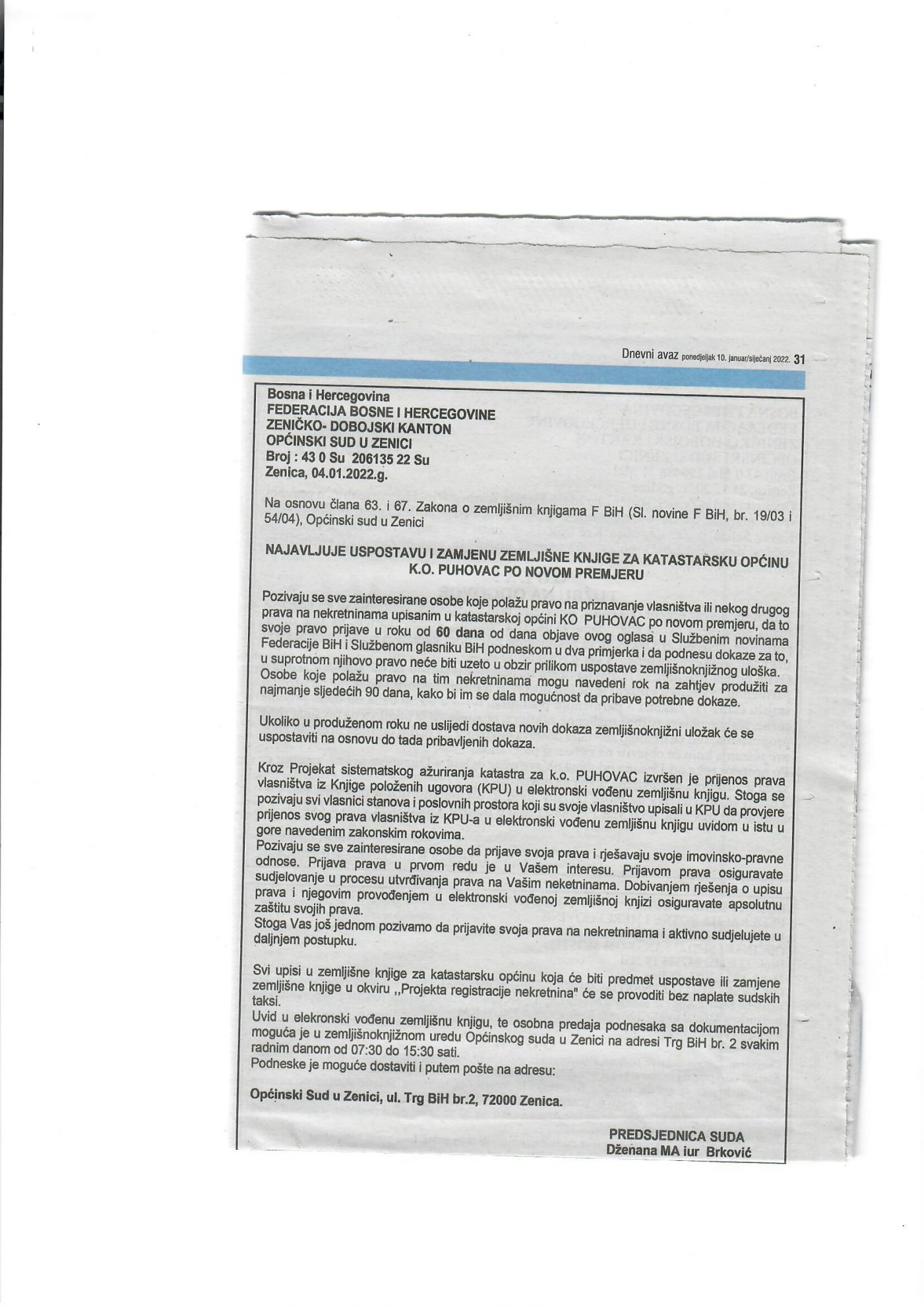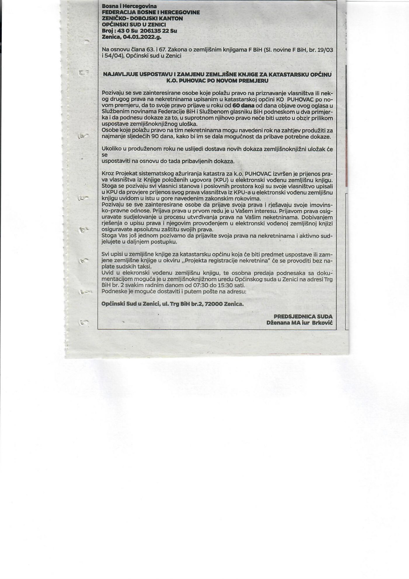 Pozivaju se sve zainteresirane osobe koje polažu pravo na priznavanje vlasništva ili nekog drugog prava na nekretninama upisanim u katastarskoj općini KO PUHOVAC po novom premjeru, da to svoje pravo prijave u roku od 60 dana od dana objave ovog oglasa u Službenim novinama Federacije BiH i Službenom glasniku BiH podneskom u dva primjerka i da podnesu dokaze za to, u suprotnom njihovo pravo neće biti uzeto u obzir prilikom uspostave zemljišnoknjižnog uloška.