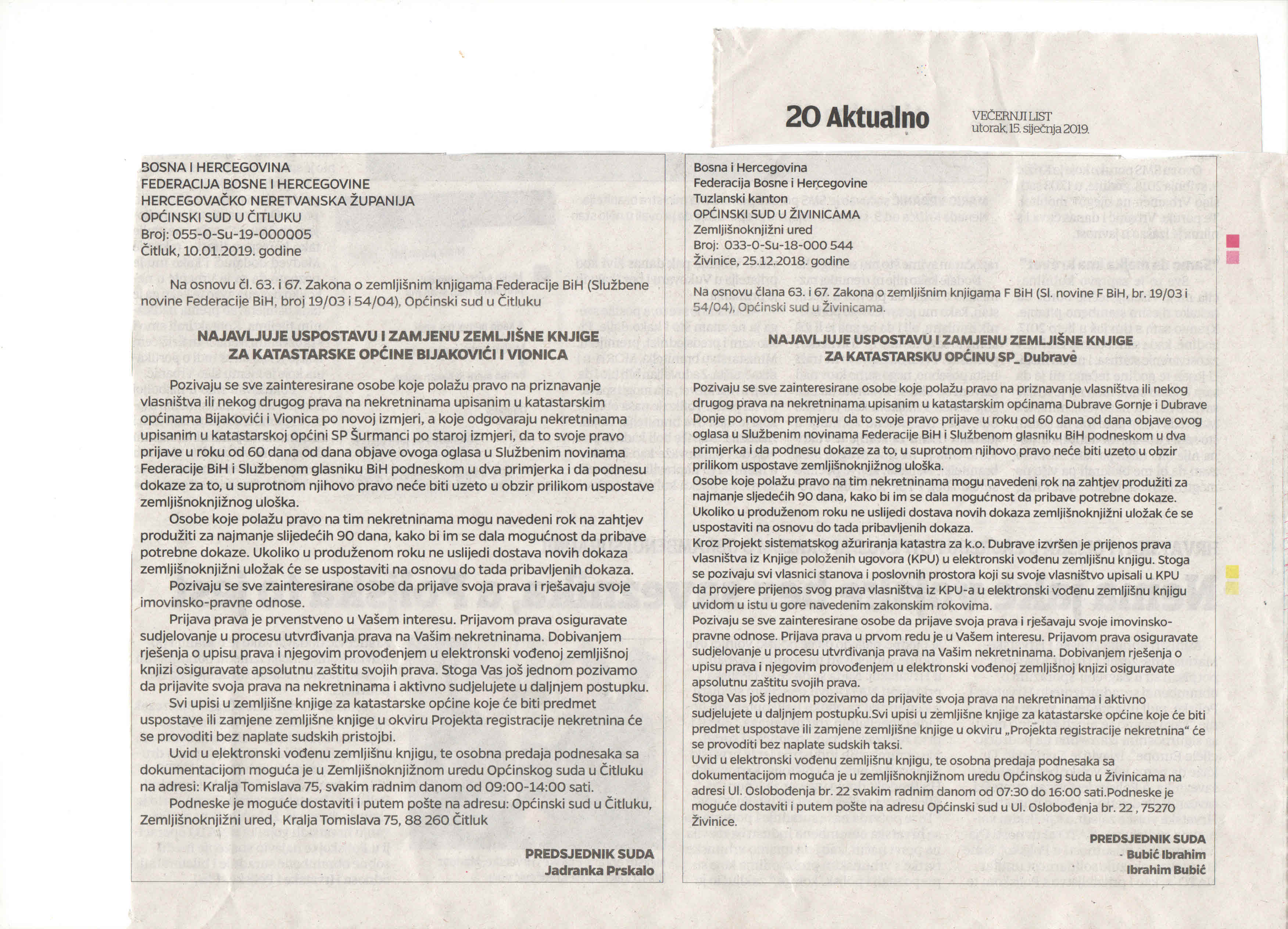U prilogu su izvodi iz novina objavljenog oglasa o najavi uspostavljanja zemljišne knjige u sklopu aktivnosti Projekta registracije nekretnina.“